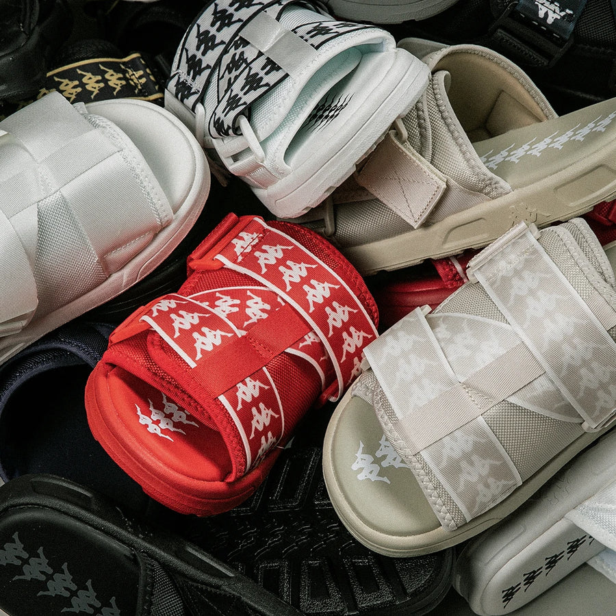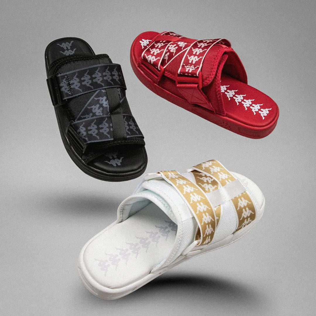 Sport-inspired unisex slides featuring the iconic Kappa Omini logo repeat and logo taping with a chunky sole.